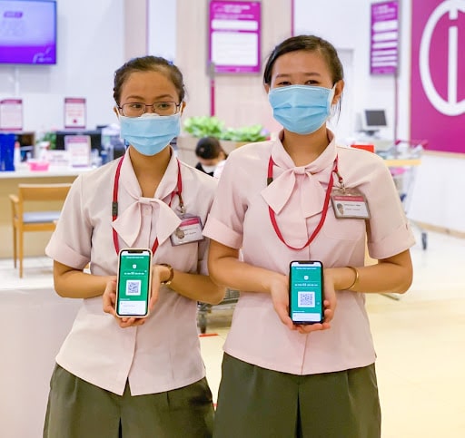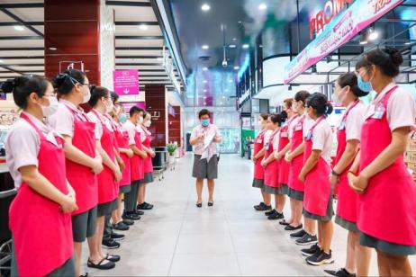 Đồng phục aeonmall có hai tông màu hồng và trắng đặc trưng của thương hiệu