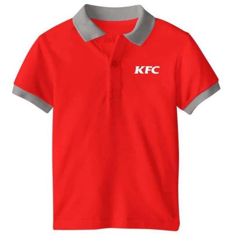- Áo phông hoặc áo sơ mi màu đỏ, phối viền trắng hoặc đen, với logo KFC in hoặc thêu ở ngực trái.