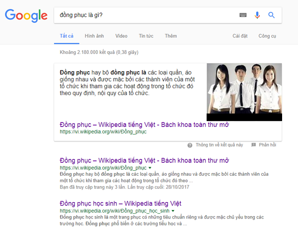 Với từ khóa “Đồng phục là gì?”, Google sẽ cho ra khoảng 2.180.000 kết quả, trong 0,38 giây. Tuy nhiên với đa số kết quả hiển thị, cách giải thích không rõ ràng, không đúng trọng tâm và đôi khi khiến cho khách hàng khó hiểu hơn.