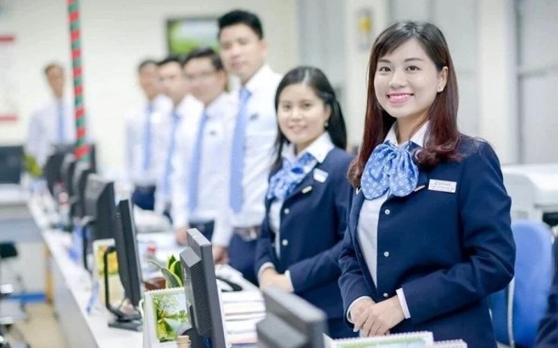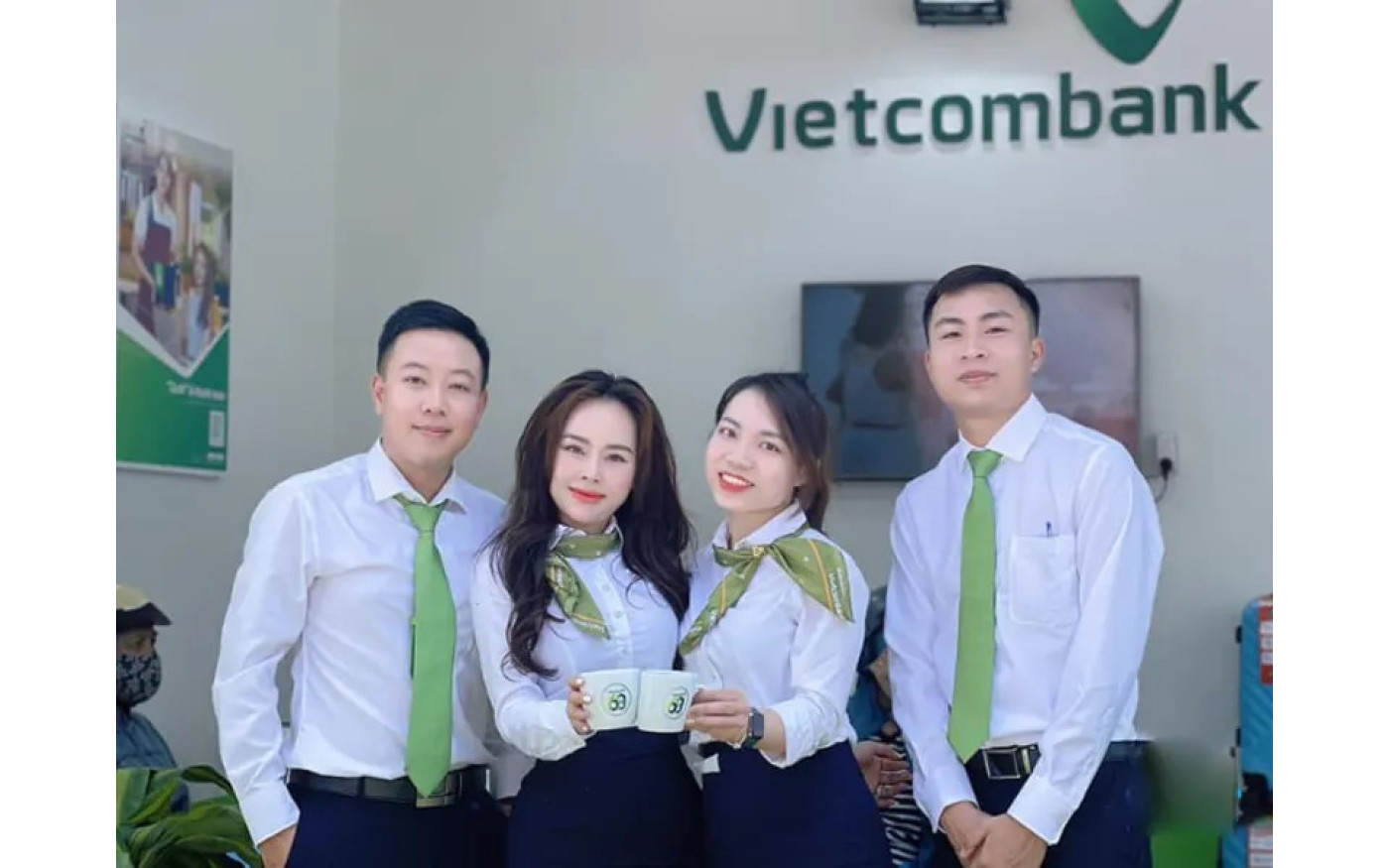 Đồng phục ngân hàng Vietcombank hiện đại với thiết kế sơ mi trắng, cà vạt và khăn choàng xanh đặc trưng