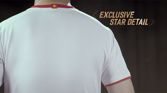 Khu vực phía trước ngực áo như thường lệ sẽ có logo của nhà trợ Grand Sport phía bên phải và Quốc kỳ của Việt Nam bên trái được in bằng công nghệ 3D. Cổ áo được may viền tròn và có ngôi sao ngay chính giữa phía sau. Ngôi sao nằm trên vai áo cũng được tạo nét chỉnh chu bởi công nghệ laser.