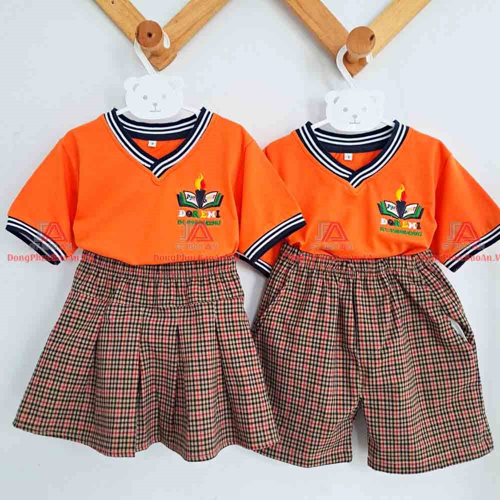 Áo thun cam nổi bật phối viền cổ V cùng chân váy và quần caro – thiết kế thoải mái, dễ vận động, phù hợp với môi trường mẫu giáo năng động và thân thiện.