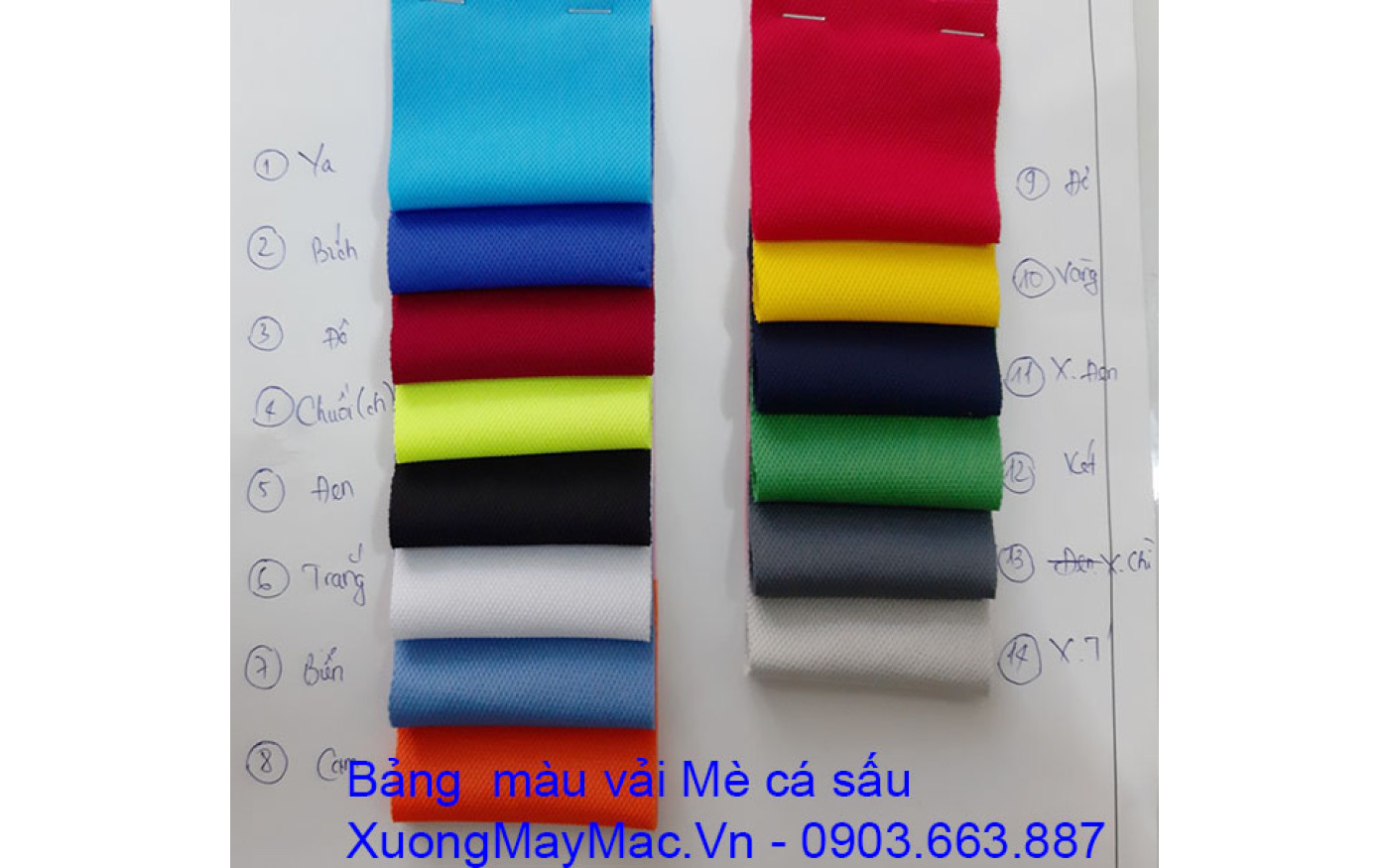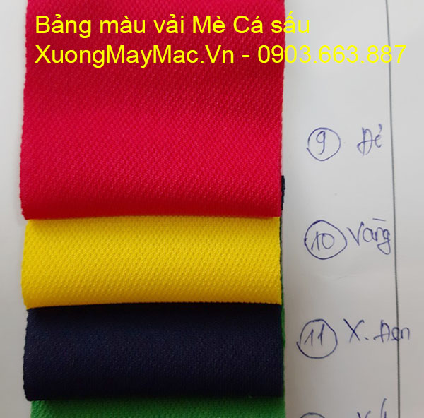 Bảng màu vải Mè cá sấu với các màu thứ tự từ trên xuống: màu Yamaha, màu Bích, màu Đô, màu Chuối