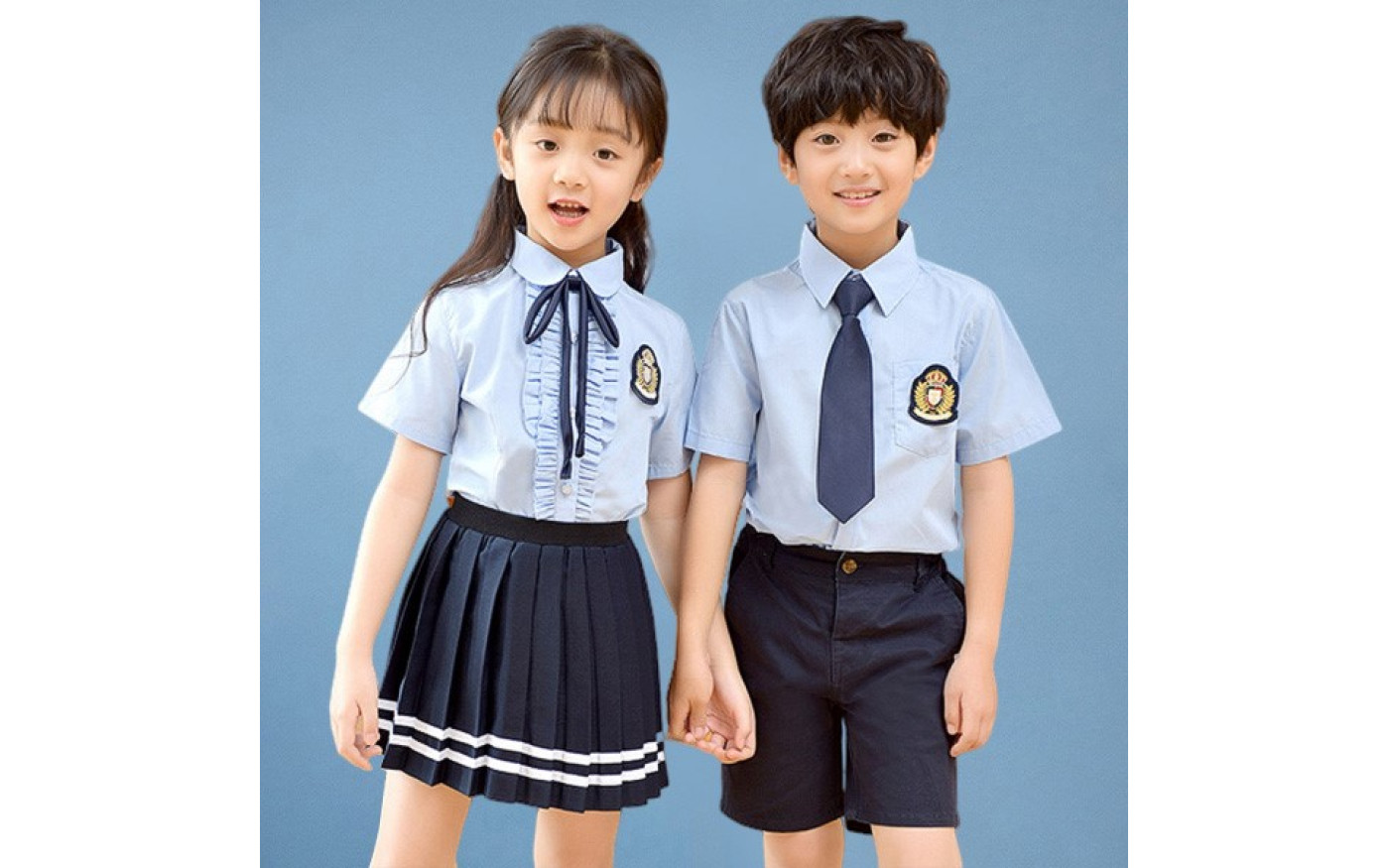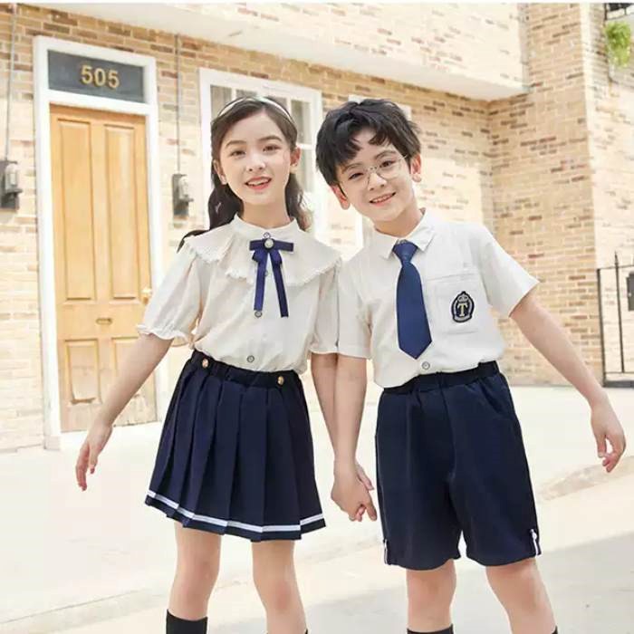 Áo sơ mi trắng phối nơ và cà vạt xanh navy, kết hợp chân váy xếp ly hoặc quần short – thiết kế trang nhã, tôn lên sự dễ thương, lịch sự cho bé trai và bé gái khi đến trường.