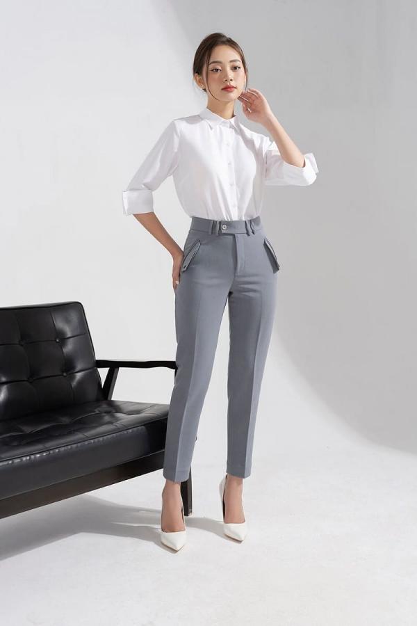 - Quần tây công sở: Thiết kế ống đứng hoặc suông nhẹ, kết hợp cùng chất liệu mềm mại, giúp người mặc luôn thoải mái suốt ngày dài làm việc.
